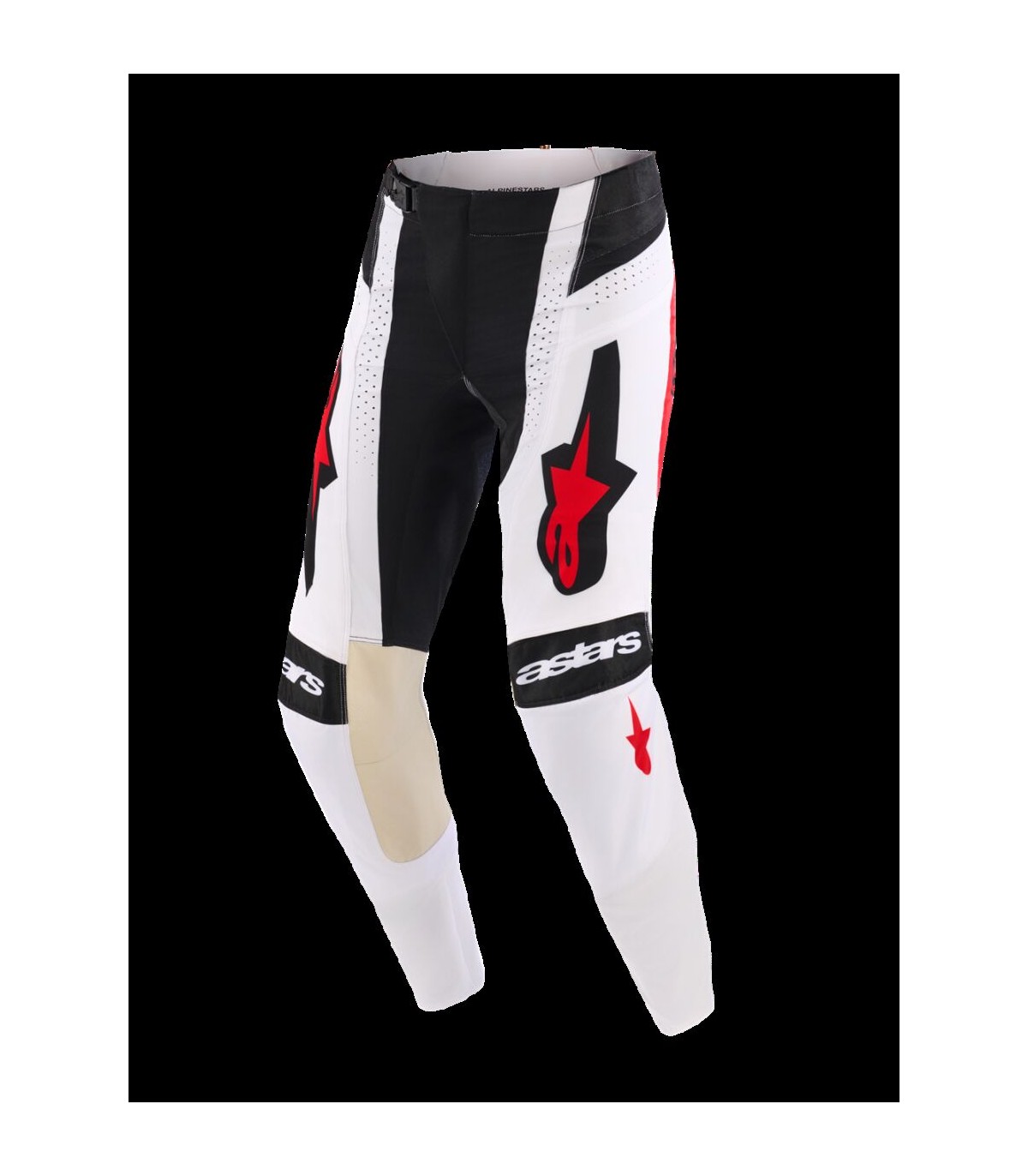 Techstar Knif PantsThe Techstar Knif Pants feature a durable 600D coated polyfabric and an advanced blend of stretch ripstop fabric for enhanced stretchability and durability.Ergonomic cut designed for performance featuring engineered racing cut with optimized multi-panel pattern delivering a second skin feel and premium freedom of movement and mobility.Performance-engineered single-layer construction and linerless design offers enhanced wearability, comfort and lighter weight while also providing effortless on and off, even with knee braces or guards.Durable 4-way stretch on the yoke, thighs, and upper knees.Seat and knees have enhanced durability due to reinforced materials.Innovative revised Babel knee gusset construction for optimal flexibility, comfort and added ventilation.Secure and quick SX2 auto-lock magnetic buckle.Strategically positioned laser perforations for additional airflow and optimum ventilation.Goat leather inner knees for premium feel and durability. Elasticated waist with silicone inner waistline keeps the pants in position.Covered zippered fly for durability.Perfect compatibility with Alpinestars' MX jerseys.