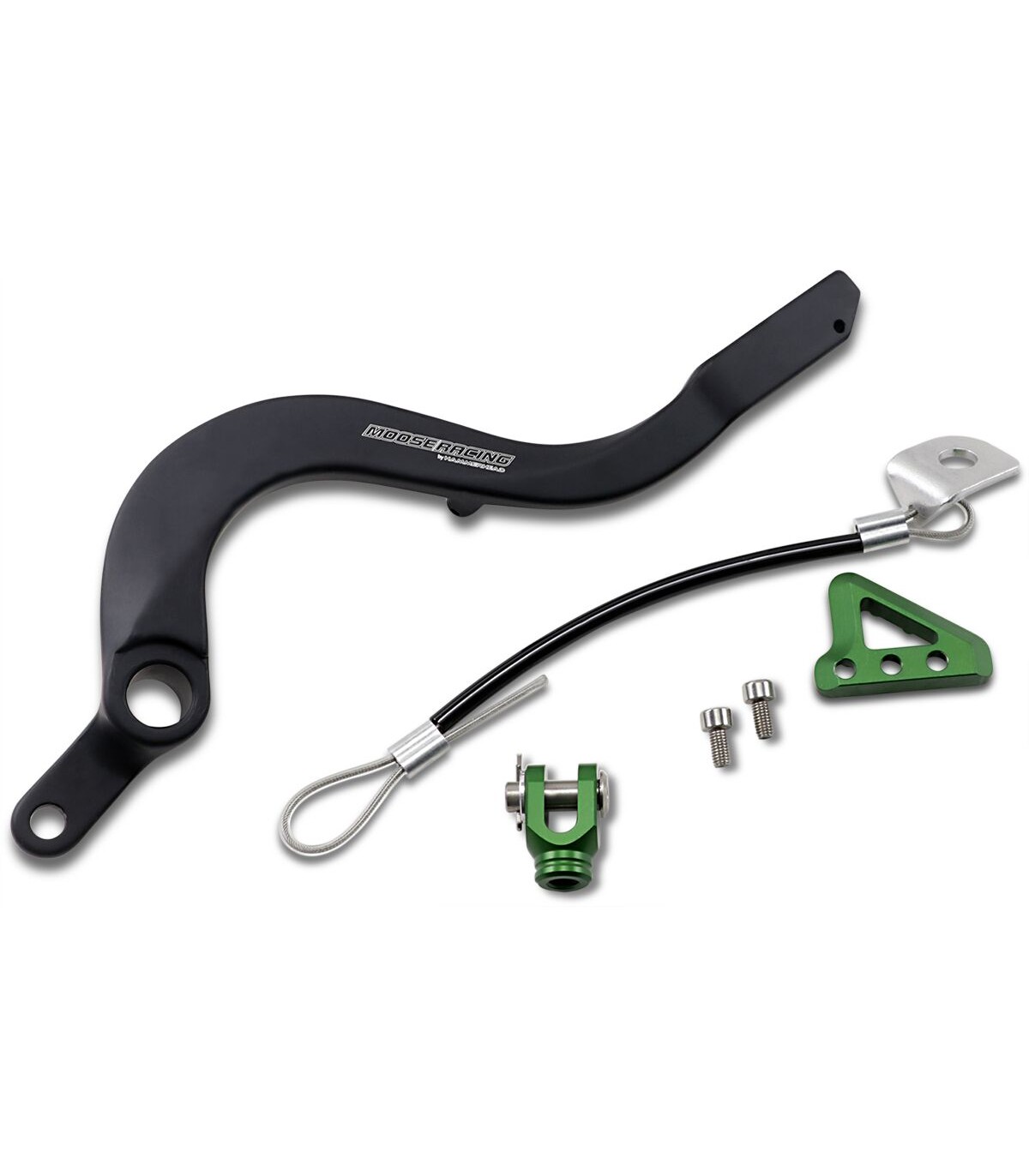 Pédale de freinMoose Racing s'est associé à Hammerhead pour vous offrir la pédale de frein ultimeLes bras de la pédale de frein sont forgés à partir d’aluminium taillé dans la masse 6061 avec axes de chape de frein en acier inoxydable et douilles de pivot en laiton.L'extrémité de frein finement usinée CNC est dotée d'un jeu de vis en acier inoxydable pour améliorer sa durée de vie et son adhérenceLes embouts des pédales de frein peuvent être ajustés dans deux positions de montage dans le sens de la longueur et sont connectés à l'aide de vis 6 pans en acier inoxydableLe bras de pédale de frein anodisé est en noir mat, tandis que les embouts sont anodisés et peints dans des couleurs différentes selon la marque de la motoChaque pédale de frein est dotée d'un câble de maintien en acier inoxydablePièce anodisée et dotée d'une protection UV pour conserver sa couleurFabrication aux États-Unis