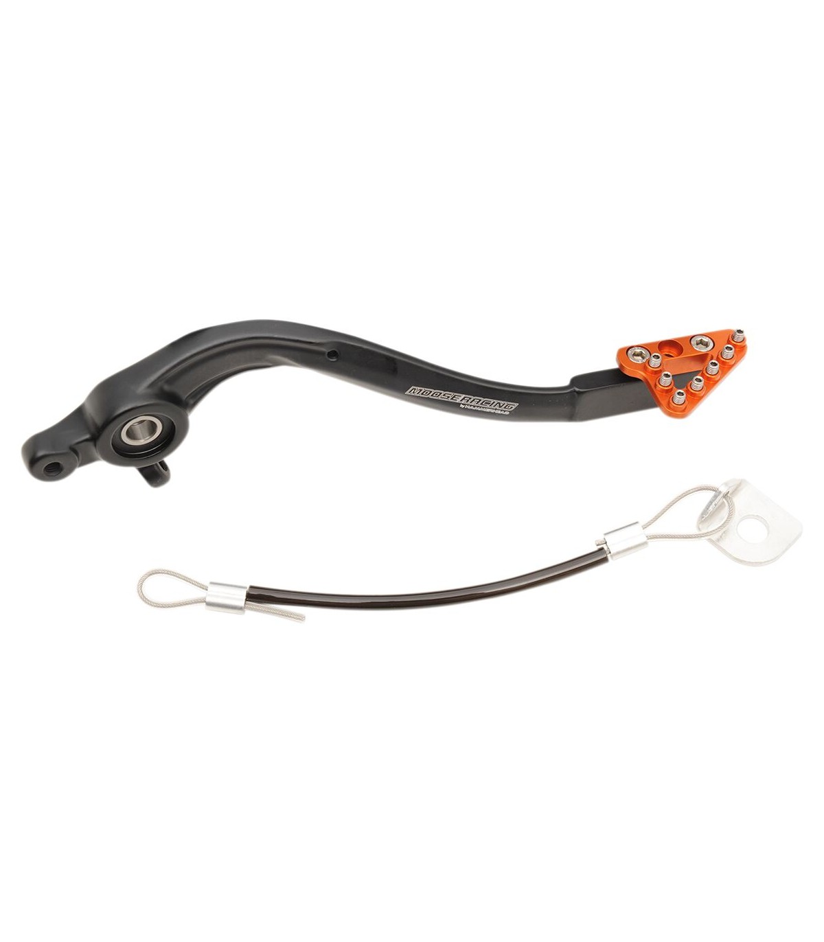 Pédale de freinMoose Racing s'est associé à Hammerhead pour vous offrir la pédale de frein ultimeLes bras de la pédale de frein sont forgés à partir d’aluminium taillé dans la masse 6061 avec axes de chape de frein en acier inoxydable et douilles de pivot en laiton.L'extrémité de frein finement usinée CNC est dotée d'un jeu de vis en acier inoxydable pour améliorer sa durée de vie et son adhérenceLes embouts des pédales de frein peuvent être ajustés dans deux positions de montage dans le sens de la longueur et sont connectés à l'aide de vis 6 pans en acier inoxydableLe bras de pédale de frein anodisé est en noir mat, tandis que les embouts sont anodisés et peints dans des couleurs différentes selon la marque de la motoChaque pédale de frein est dotée d'un câble de maintien en acier inoxydablePièce anodisée et dotée d'une protection UV pour conserver sa couleurFabrication aux États-UnisLes pédales de frein KTM incluent deux roulements de précision au niveau du point de fixation