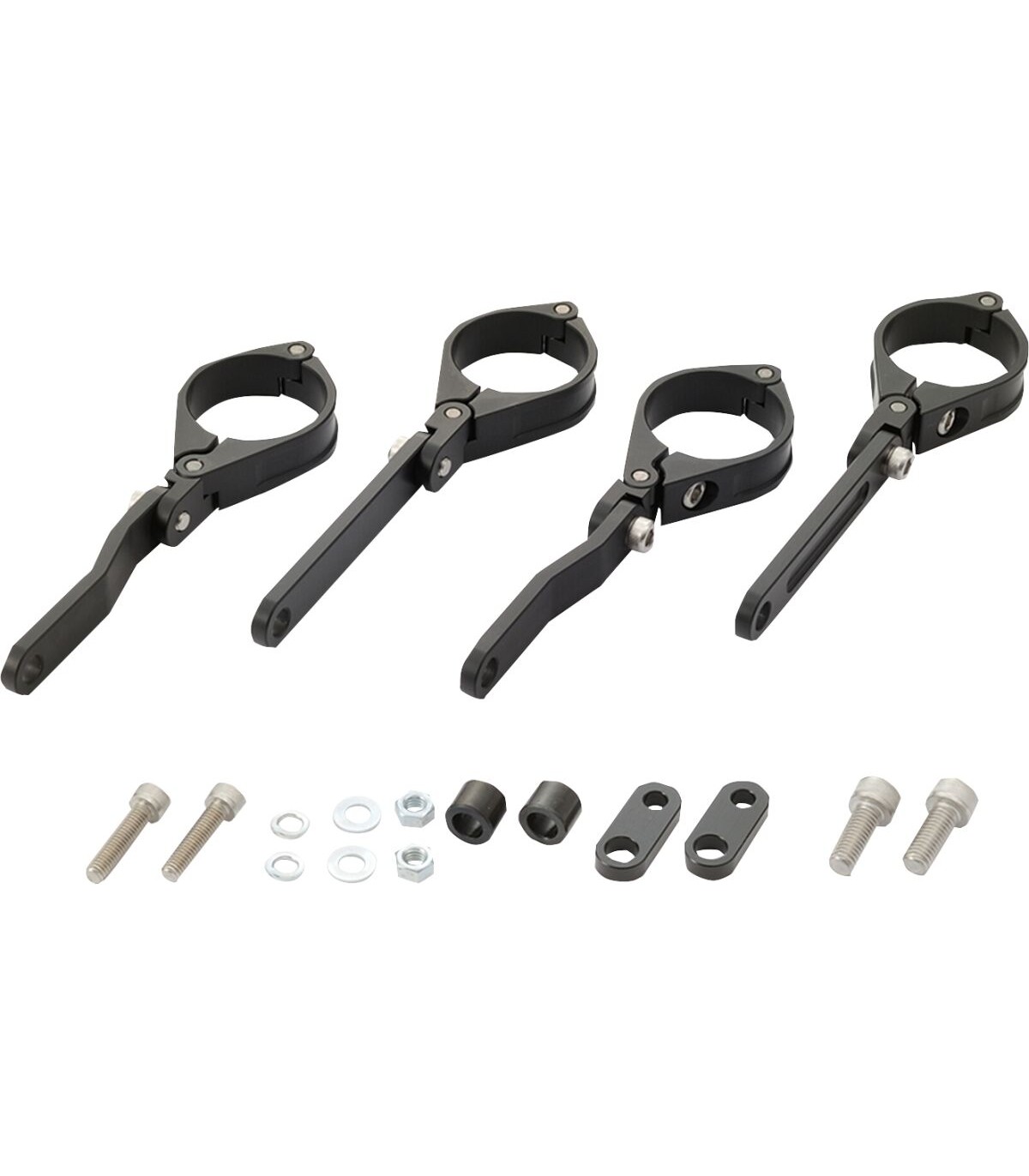 Headlight Bracket SetAdjustable dual-axis headlight bracket made of CNC machined aluminium in blackThe fork clamp can be adjusted vertically, allowing the headlight position to be adjusted in the front-back directionJoints on all four clamps allow the width of the headlight mount to be varied and the braces to run parallelM8 indicator mount kit is included for discreet installation