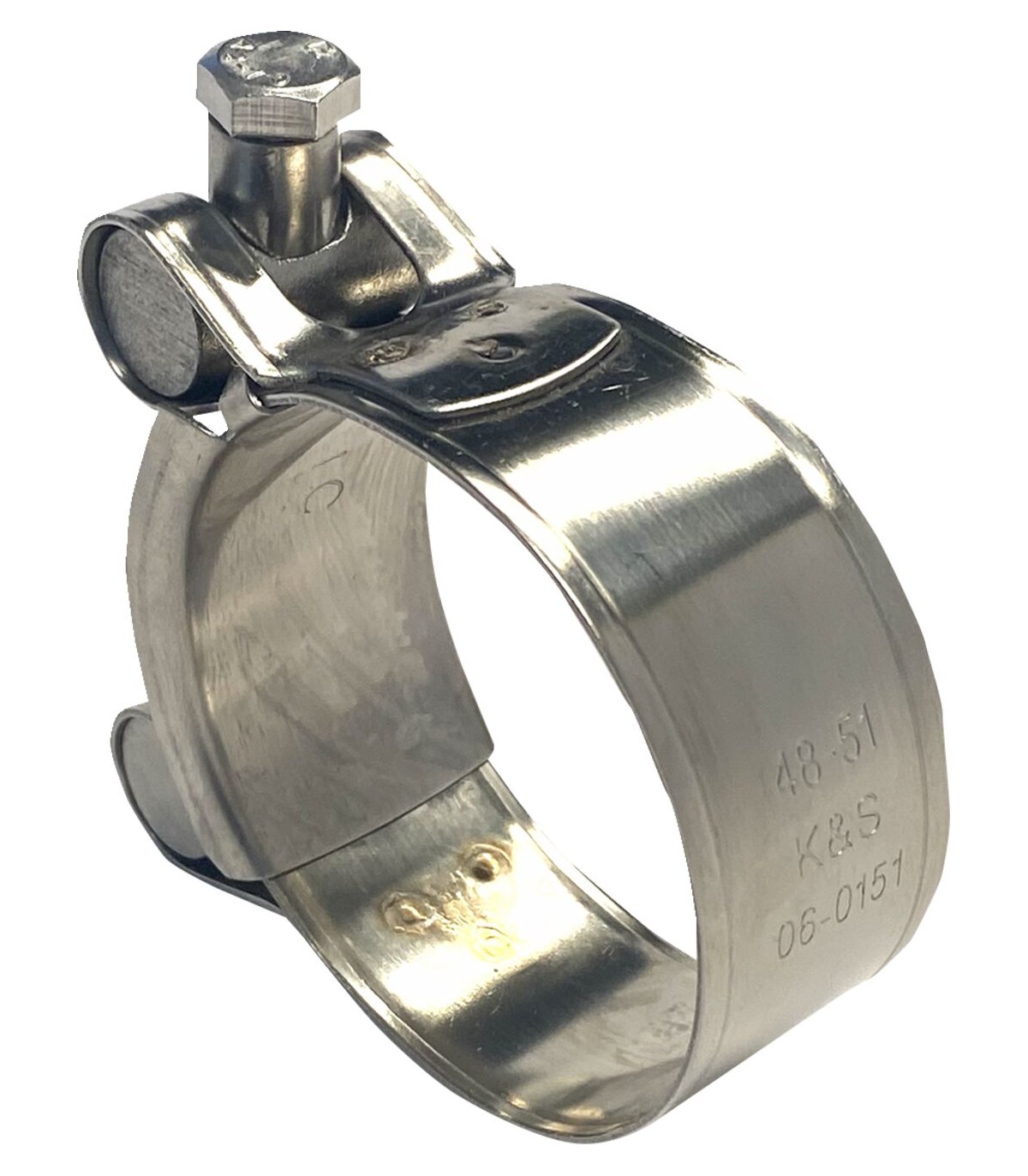 Exhaust Pipe ClampCorrosion resistant and temperature resistantBarrel-and-band design for high clamping pressureSold individually; packer in poly bag and K&S header card