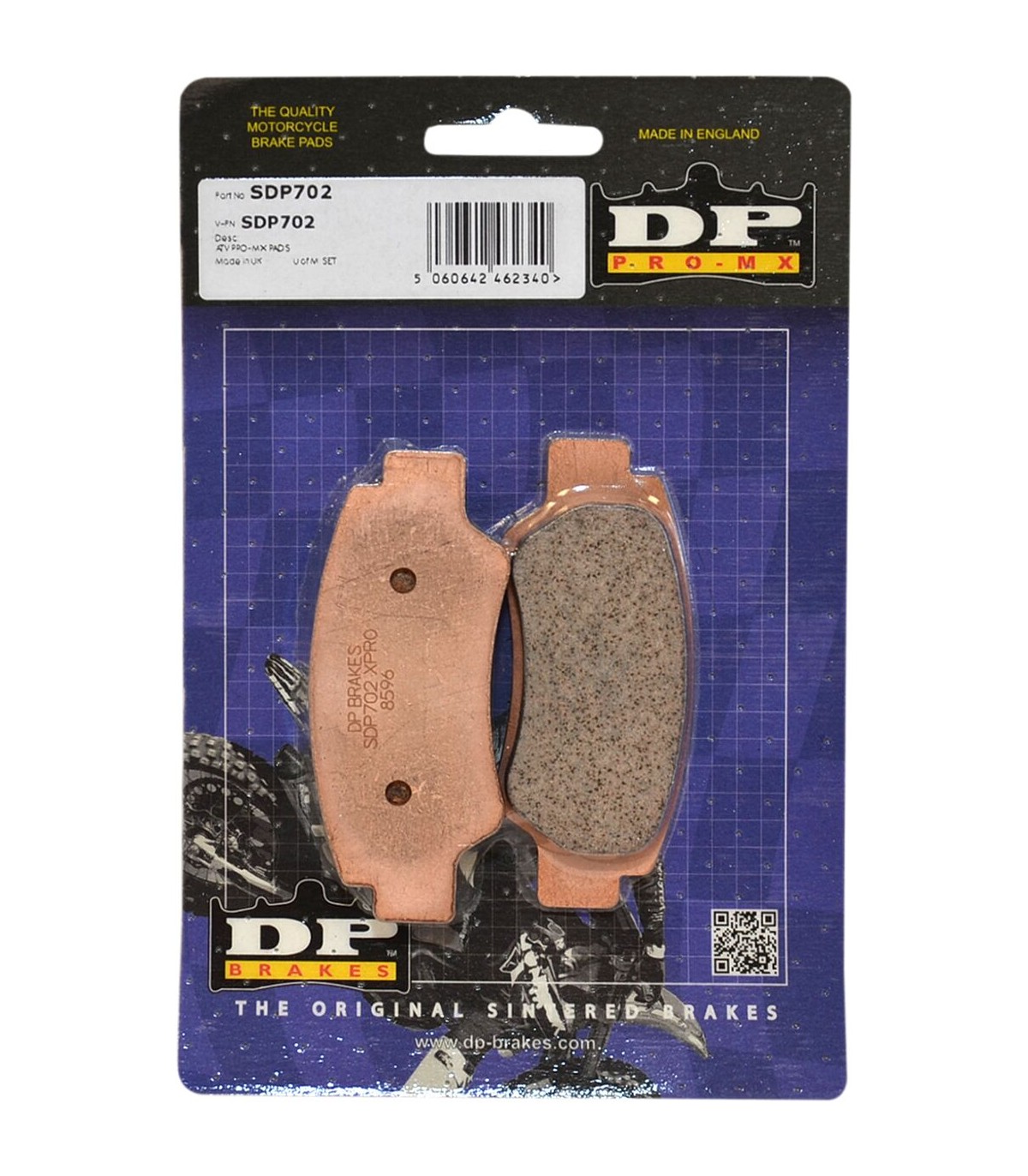 Plaquettes de frein ultra performantes SDP Pro MXDéveloppées par des pilotes Pro Factory pour un usage avec MX, Enduro, Hare Scrambles, Supercross et tout-terrain pour lesquels la performance est un facteur essentiel Matériau avec un coefficient de friction HH haute performance Adaptées aux conditions humides et sèches Efficacité de freinage constante Réponse initiale excellente et rodage rapide Le matériau en céramique de pointe à base de zirconium gris sur la plaque arrière fait office de pare-chaleur dans des conditions de course les plus éprouvantes Les plaquettes DP PRO MX sont disponibles pour un nombre limité de modèles MX Sport est recommandé pour tous les usages de compétition motocross et enduro