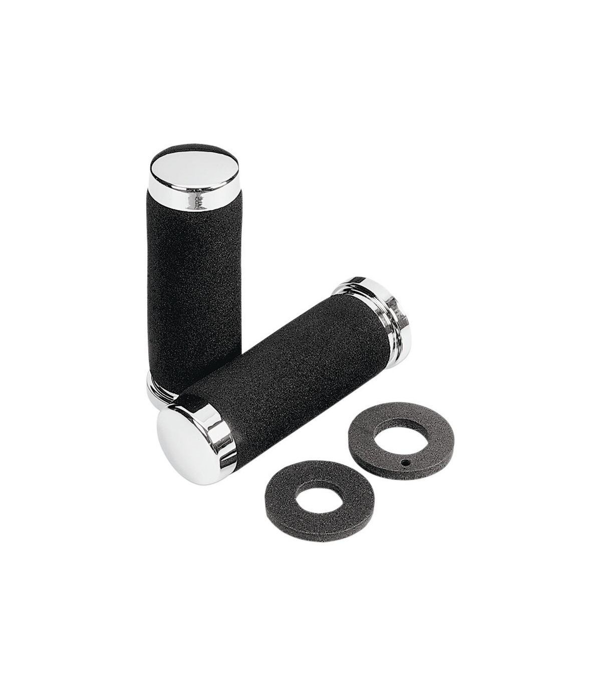 Poignées CruiserUne poignée cruiser classiquePoignées amortisseuses recouvertes de mousseEmbouts en chrome moulésPour les guidons de 22 mm (7/8") ou 25,4 mm (1")