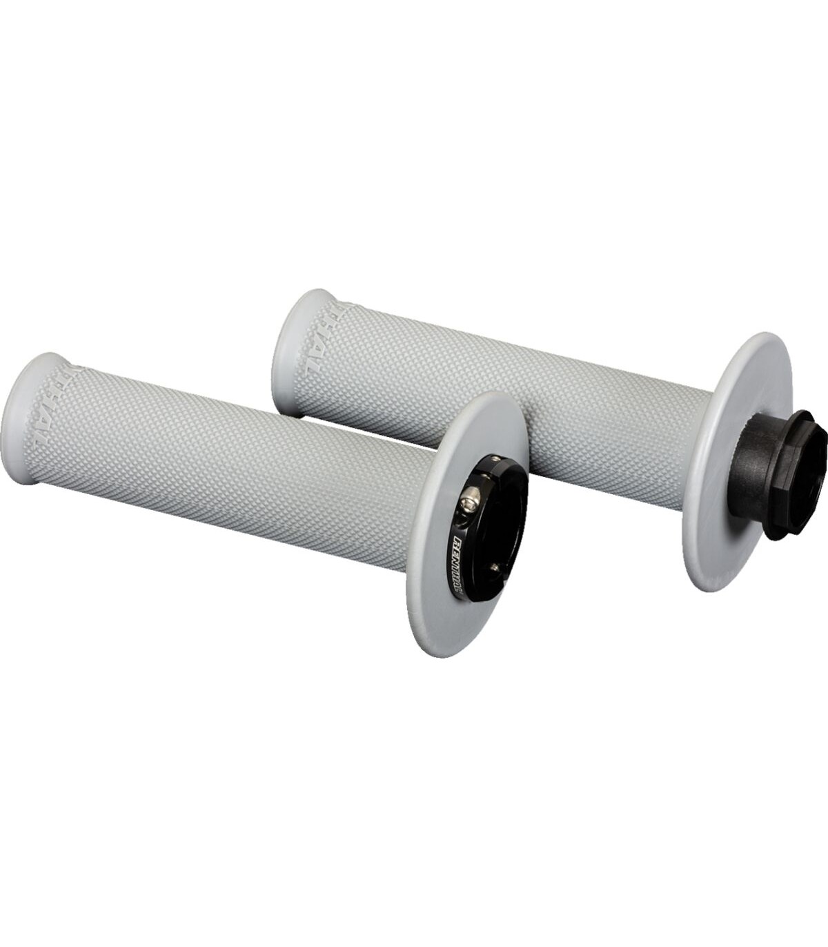 MX Original Lock-On GripsLock-on grip is fit for installation on any aftermarket handlebar without the need for modification while retaining full clamping forceTwin split collar design means you are able to slide the clutch side grip over any knurled MX handlebars without any sanding or modification, ensuring the clamp is permanently bonded to the gripEach pair of grips comes with a set of 6 throttle cams; cams cleanly snap on with a simple press fitment design and provide smooth throttle actionTuff-End Tech provides 4 mm thick solid plastic end caps with a premium and vibrant Renthal ‘R’ logo to minimize damage that can incur during a crash or tip over, allowing you to finish your ride or race without failure