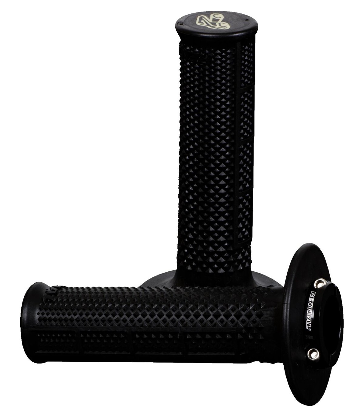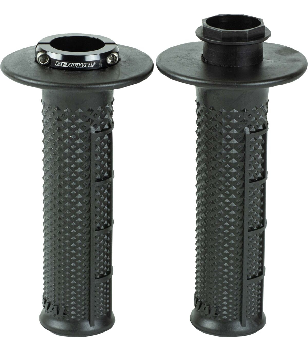MX R-Works Lock-On GripsLock-on grip is fit for installation on any aftermarket handlebar without the need for modification while retaining full clamping forceTwin split collar design means you are able to slide the clutch side grip over any knurled MX handlebars without any sanding or modification, ensuring the clamp is permanently bonded to the gripEach pair of grips comes with a set of 6 throttle cams; cams cleanly snap on with a simple press fitment design and provide smooth throttle actionTuff-End Tech provides 4 mm thick solid plastic end caps with a premium and vibrant Renthal ‘R’ logo to minimize damage that can incur during a crash or tip over, allowing you to finish your ride or race without failure