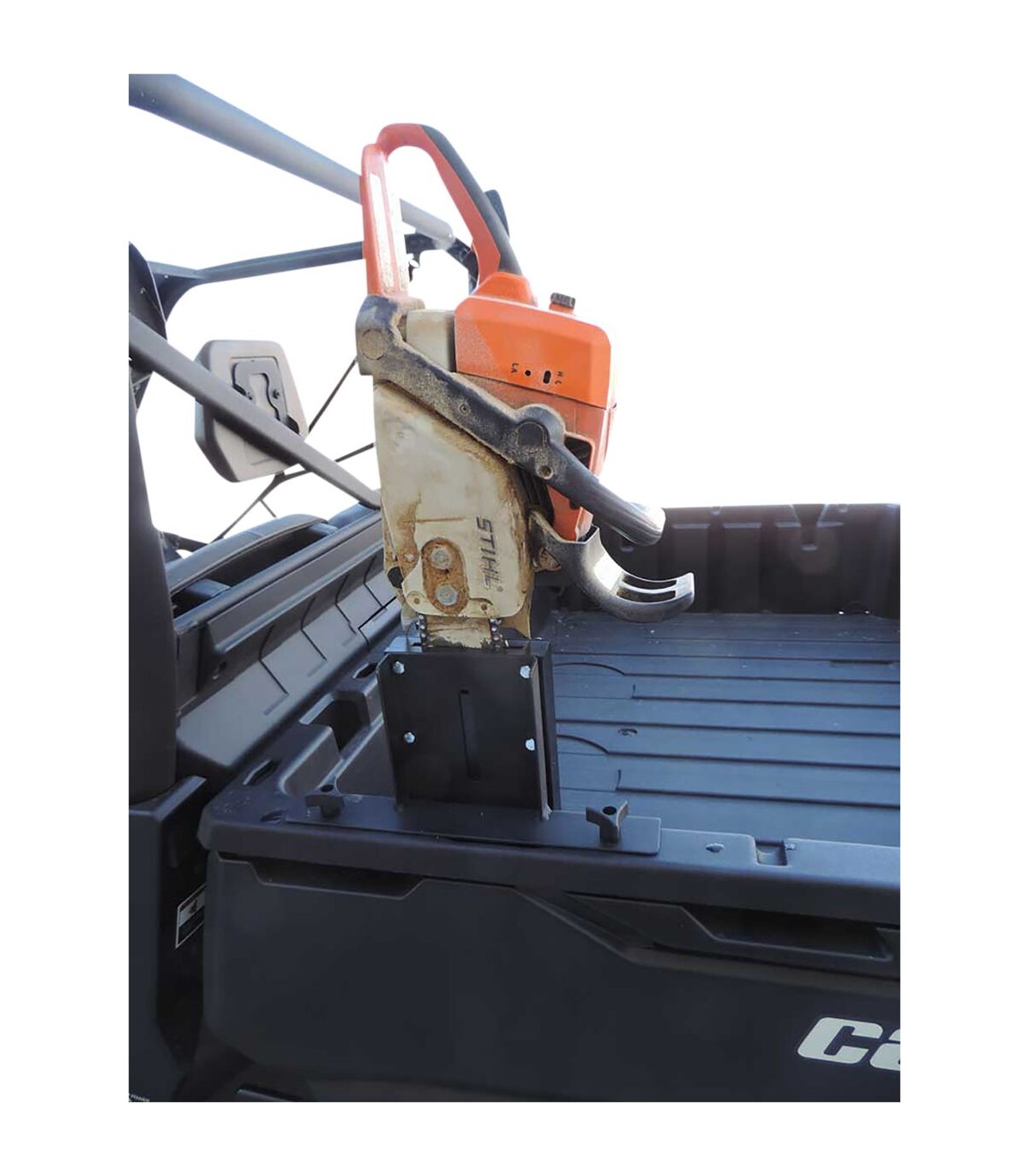 Dispositif de fixation pour tronçonneusePermet de fixer une tronçonneuse en toute sécurité à l’intérieur d’une benneUsinage à partir de polyéthylène haute densité et associé à une armature à traitement époxy en acier solideComprend deux systèmes de fixation Twist-N-Lock