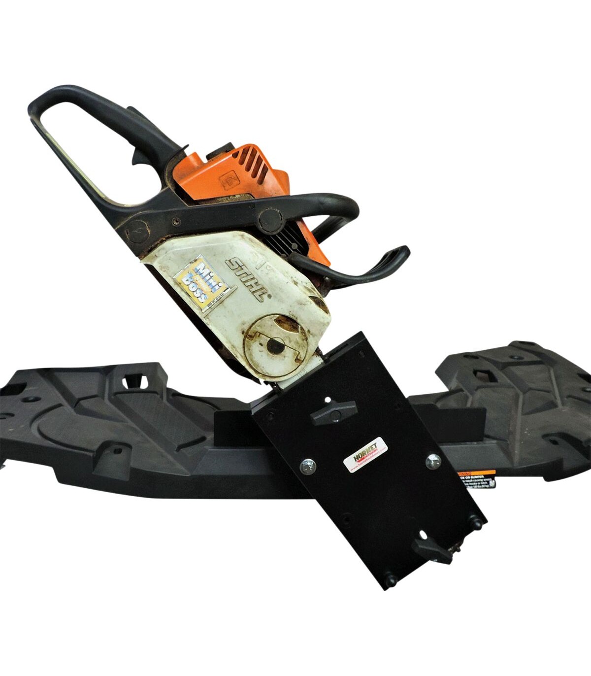 Chainsaw MountTransport your chainsaw on your SportsmanFeatures an open bottom to accommodate long barsSimply slip saw in to the scabbard and tighten the bar knobs to minimize movement while drivingIncludes two Twist Lock anchors for attachment of the mount to the REAR plastic deck