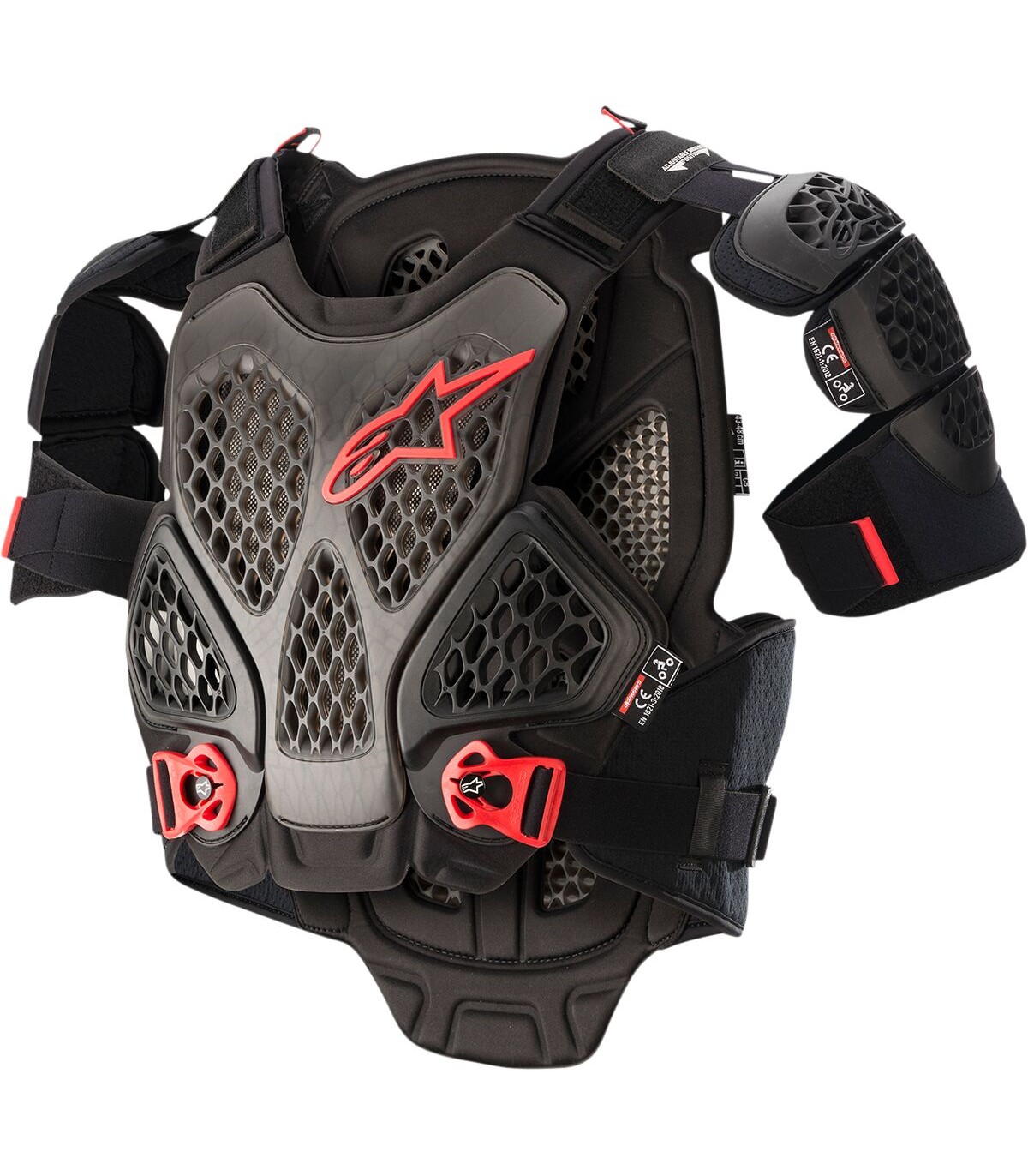 Protection de poitrine A-6Les coques en plastique des protections dorsale et de poitrine sont fabriquées dans un mélange polymérique hautes performances pour plus de souplesse et de légèreté.Les coques en plastique sont pourvues de larges zones perforées aux endroits stratégiques, offrant une respirabilité et une aération excellentes.Le châssis rembourré thermoformé et les éléments latéraux rembourrés confèrent au pilote un confort optimal.Le système d’attache rapide réglable à la taille permet un ajustement sur mesure et garantit que la protection reste toujours immobile et près du corps.Les éléments latéraux flexibles à l’avant sont reliés à la protection de poitrine principale au moyen de trois fixations grâce auxquelles ils peuvent bouger indépendamment et épouser les formes naturelles du corps.Panneau dorsal amovible pour que le tour de cou BNS puisse être utiliséSachant que les protections d’épaule sont amovibles, cette protection pour haut du corps peut être transformée ; le pilote a donc la possibilité de l’adapter sur mesure aux conditions de conduite.Les protections d’épaule amovibles sont dotées d’un système de fixation par scratchs qui permet de les ajuster parfaitement sur le haut du bras.Protections d’épaule de niveau 1Protection dorsale de niveau 2Protection de poitrine de niveau 2