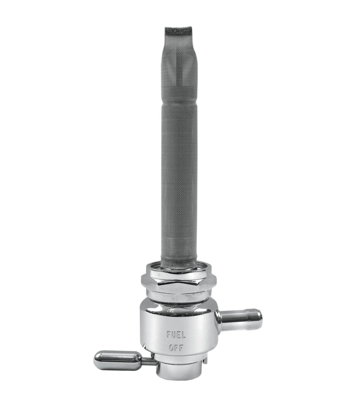 Robinet d’essence avec arrêt « OFF » fermeRobinet rond avec des leviers dotés de butées d'arrêt pour les positions on et réserve, ainsi que d'un cran pour la position off, au centreLes valves disposent d'un corps en laiton, avec un placage chromé qui donne une belle finitionDébit de carburant largement plus élevé par rapport aux valves d'essence d'origine ou aftermarketÉcrou adaptateur de 22mm inclusFabrication aux États-Unis.Toutes les descriptions sont faites à partir de la position assise sur la moto avec une référence de la position de sortie à la position off du levier de valve d'essence.