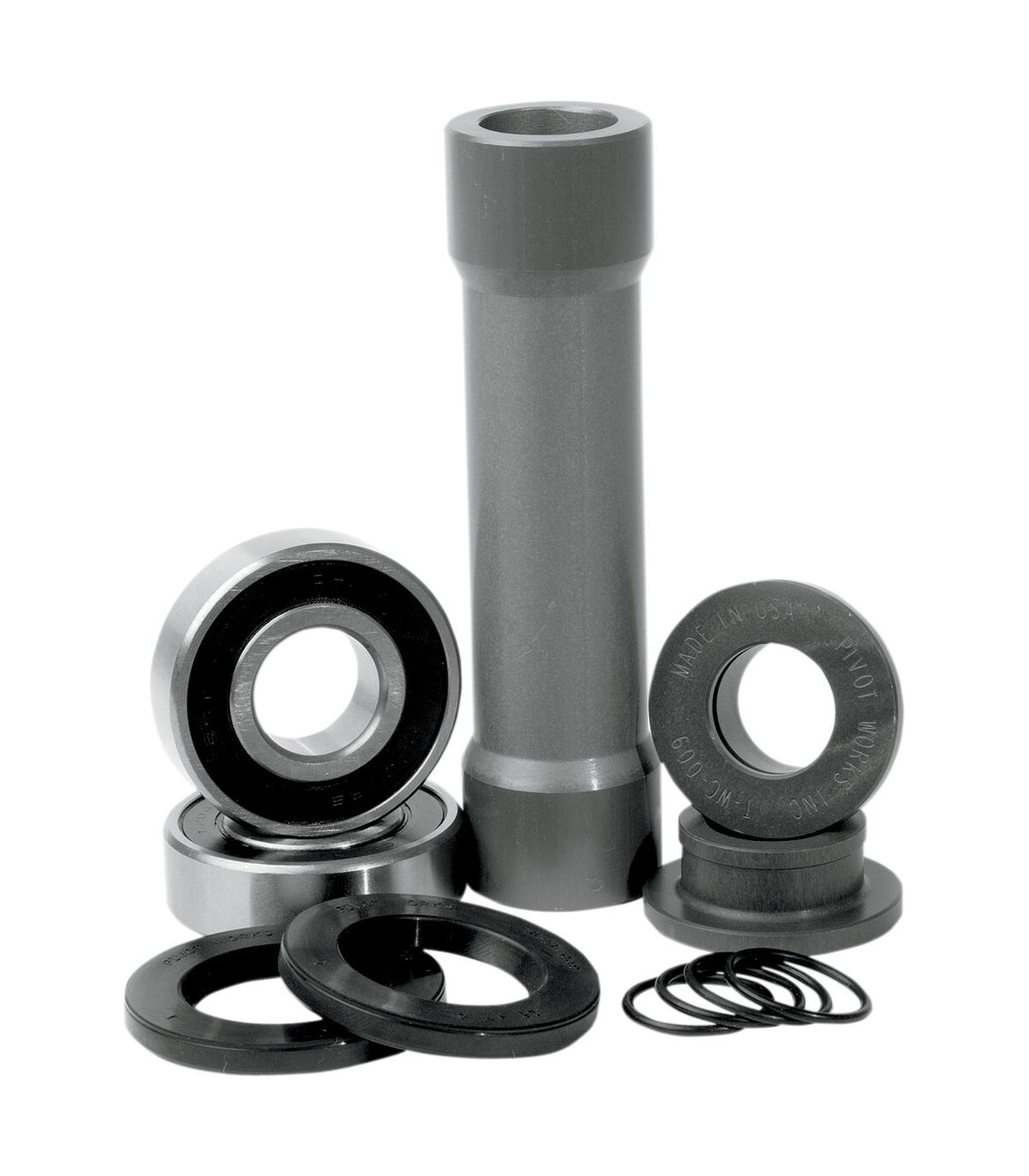 Rear Wheel Bearing Upgrade KitBearings incorporate larger balls providing larger load carrying capacity, and now sit on the axle instead of the wheel collarsCollars and bearing spacer made of military hard anodizing to prevent wearCollars incorporate Pivot Works watertight O-ring design to keep hubs dryUpgrade kit includes:BearingsSealsWatertight wheel collarsBearing spacerTwo sets of O-ringsReplacement bearings and seals sold separately.