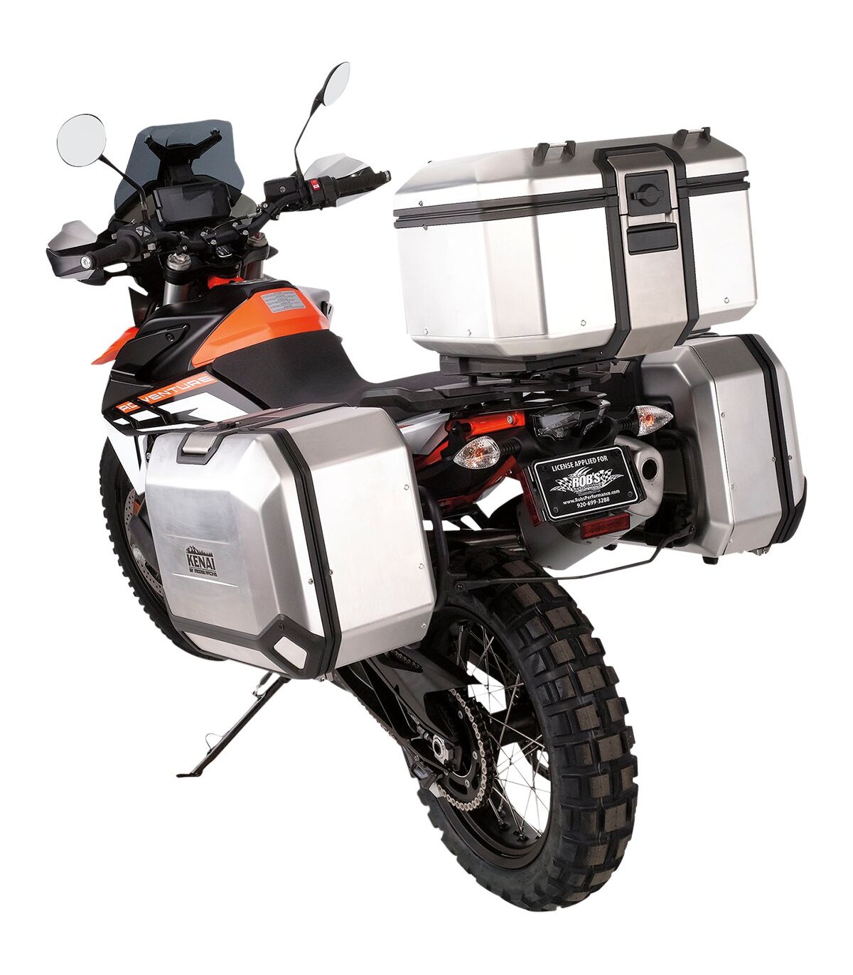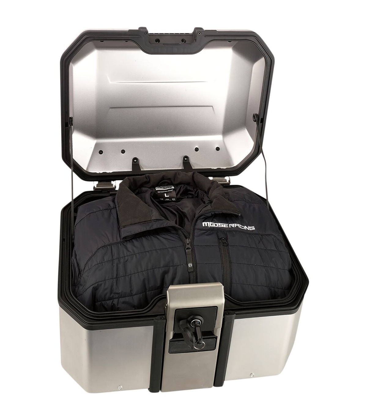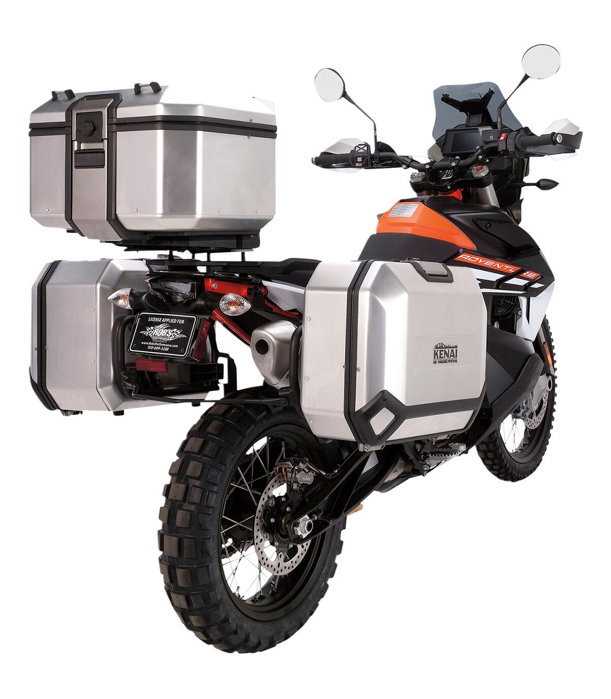 Top case KenaiFabrication en alliage d’aluminium durci haute qualité et finition anodisée transparente évitant la décolorationLe système de verrouillage en acier inoxydable AISI 304 intégré est composé d’une poignée permettant de bloquer la valise sur le support et de sécuriser l’ouverture du couvercle qui donne accès au contenu.Le système de verrouillage breveté s’installe et se retire rapidement et aisément.Une fois que la valise a été dégagée de la patte de fixation, il est possible d’utiliser sa poignée comme poignée de transport.Système de verrouillage reposant sur un code unique valable pour toutes les opérations (fixation sur le support, ouverture du top case)Les cadenas incluent des protections anti-poussière.Fermeture étanche deux niveaux (compartiment + couvercle) empêchant la pénétration d’eau dans la valiseLes valises sont conçues pour être autoporteuses lorsqu’elles ne sont pas fixées sur la moto ; elles peuvent être utilisées avec un risque de détérioration minimum du fait des protections intégrées.La finition époxy sur les fixations garantit que la surface de montage résiste à la corrosion.Tous les kits de montage renferment des pattes de fixation et prévoient des points d’installation compatibles avec le modèle de moto.Tous les kits sont livrés avec matériel de montage et notice d’assemblage.Quatre crochets en acier inoxydable AISI 304 intégrés dans le couvercle pour des points de montage supplémentaires, augmente la capacité de stockage. La fixation de dosseret en option 3501-1831 peut être utilisée sur les top cases de 37/48 litres pour amé