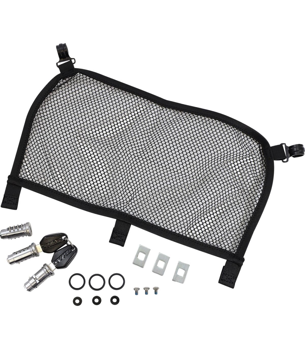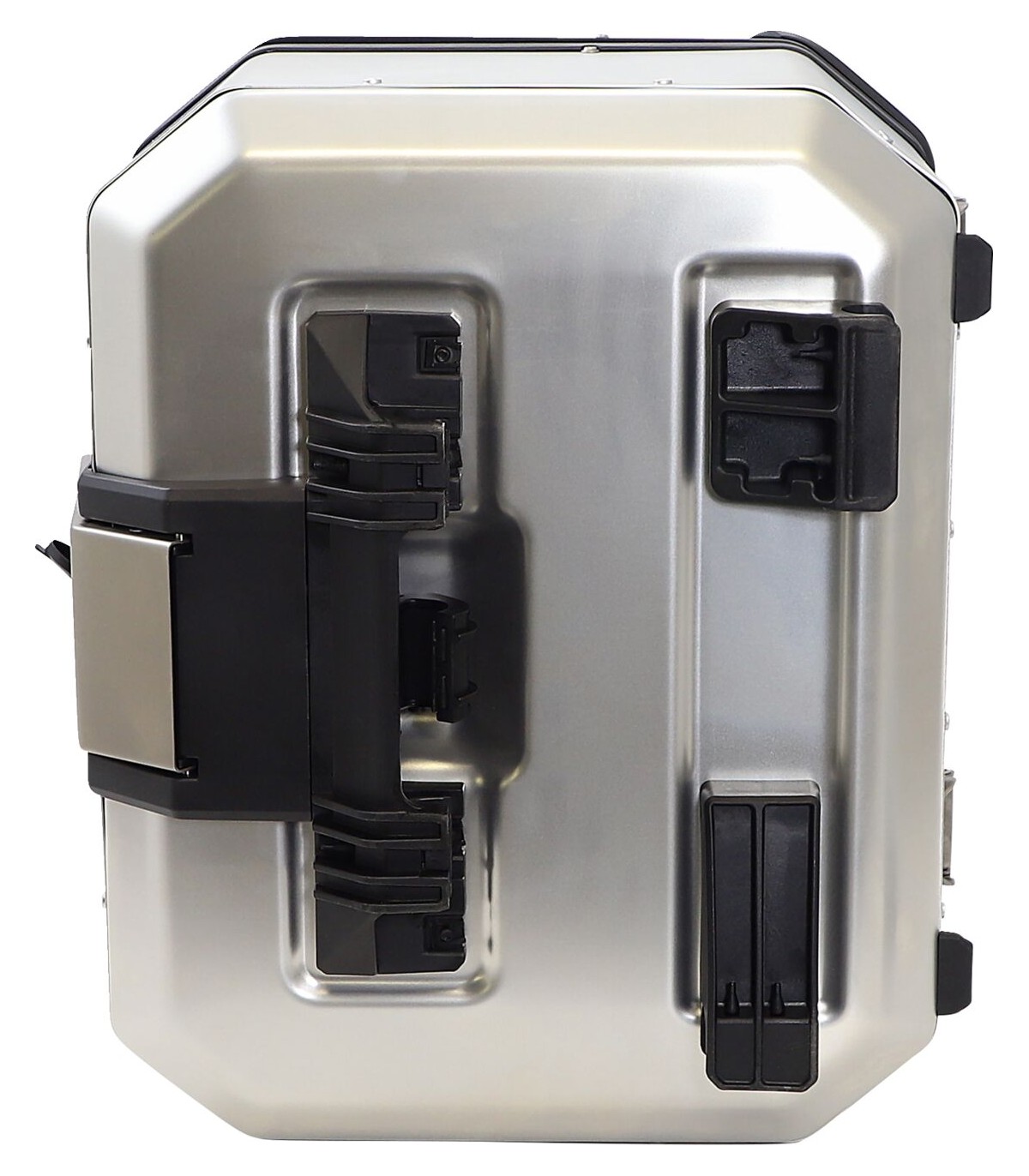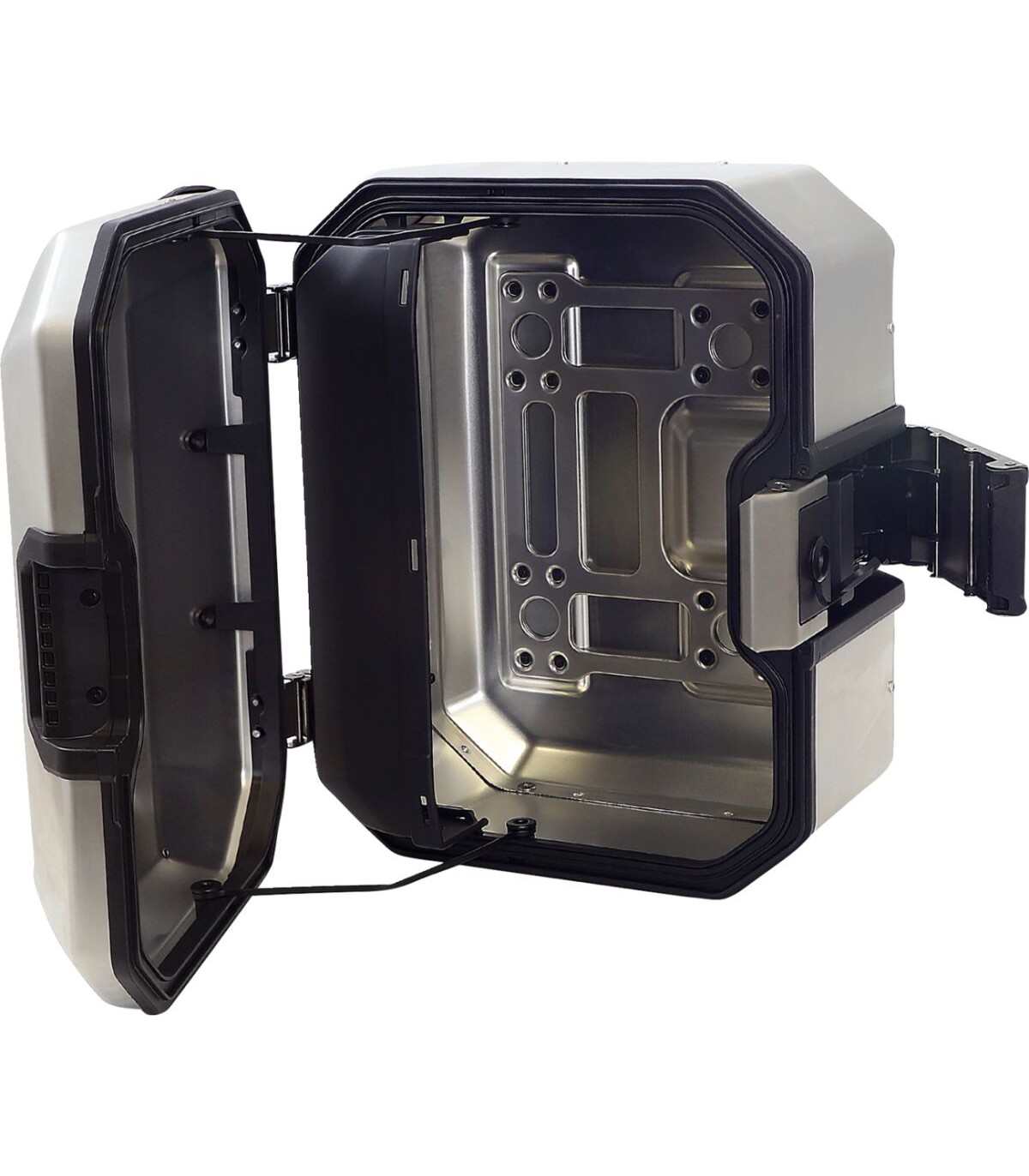 Top case KenaiFabrication en alliage d’aluminium durci haute qualité et finition anodisée transparente évitant la décolorationLe système de verrouillage en acier inoxydable AISI 304 intégré est composé d’une poignée permettant de bloquer la valise sur le support et de sécuriser l’ouverture du couvercle qui donne accès au contenu.Le système de verrouillage breveté s’installe et se retire rapidement et aisément.Une fois que la valise a été dégagée de la patte de fixation, il est possible d’utiliser sa poignée comme poignée de transport.Système de verrouillage reposant sur un code unique valable pour toutes les opérations (fixation sur le support, ouverture du top case)Les cadenas incluent des protections anti-poussière.Fermeture étanche deux niveaux (compartiment + couvercle) empêchant la pénétration d’eau dans la valiseLes valises sont conçues pour être autoporteuses lorsqu’elles ne sont pas fixées sur la moto ; elles peuvent être utilisées avec un risque de détérioration minimum du fait des protections intégrées.La finition époxy sur les fixations garantit que la surface de montage résiste à la corrosion.Tous les kits de montage renferment des pattes de fixation et prévoient des points d’installation compatibles avec le modèle de moto.Tous les kits sont livrés avec matériel de montage et notice d’assemblage.Le top case de 47 litres permet de ranger jusqu'à 2 casques. La pièce 3501-1832 peut être fixée sur le bac rabattable et le haut du bagage pour éviter le déplacement/la chute du contenu lorsque le couvercle est ouvert. Permet de voir le contenu sans décha