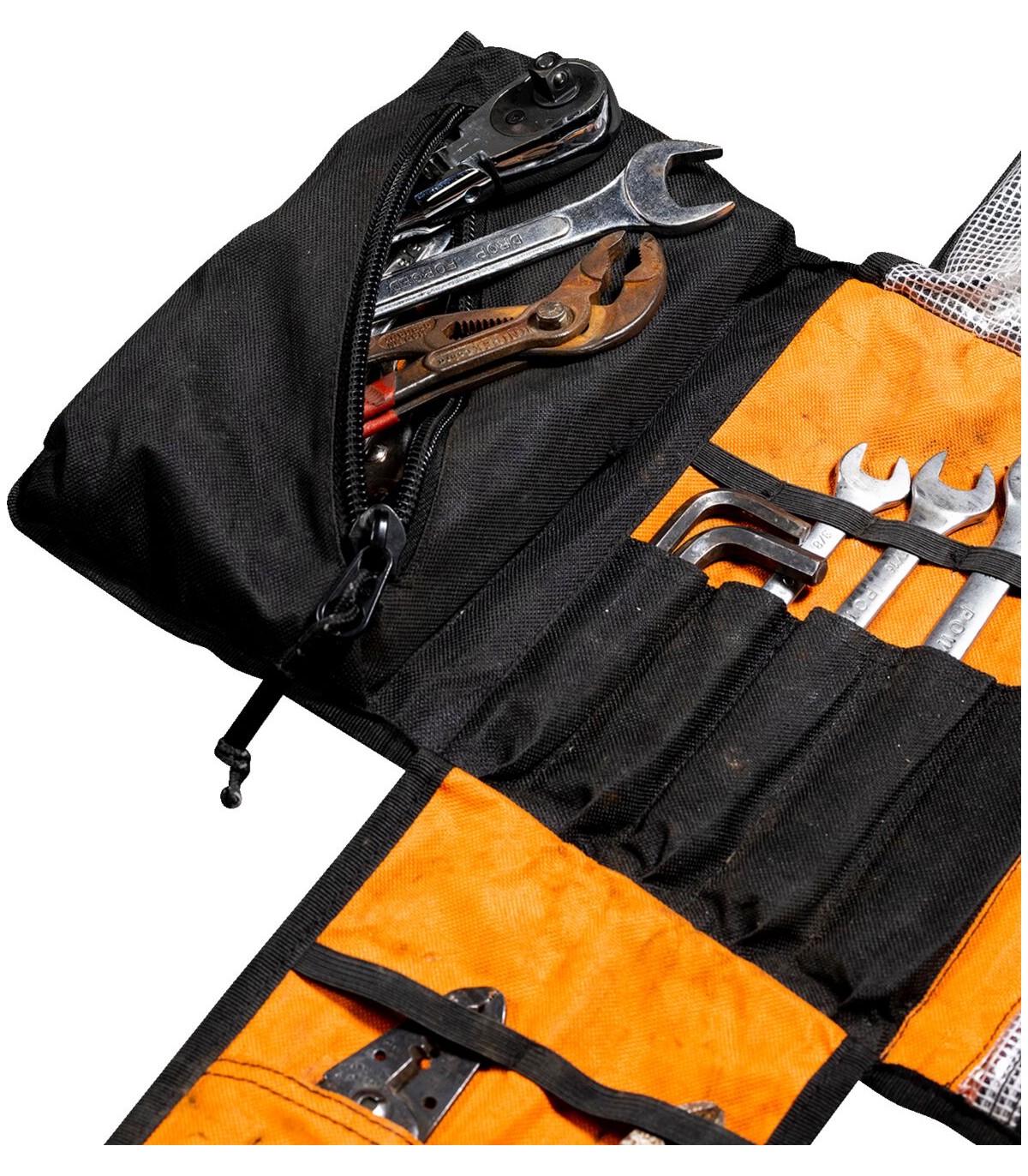 Trousse à outils EXFIL-0Pochette interne à fermeture éclair pour les petits objetsMatière extérieure en polyester anti-abrasion 600 deniersDoublure intérieure orange haute visibilitéSystème de fermeture par scratch dépliable