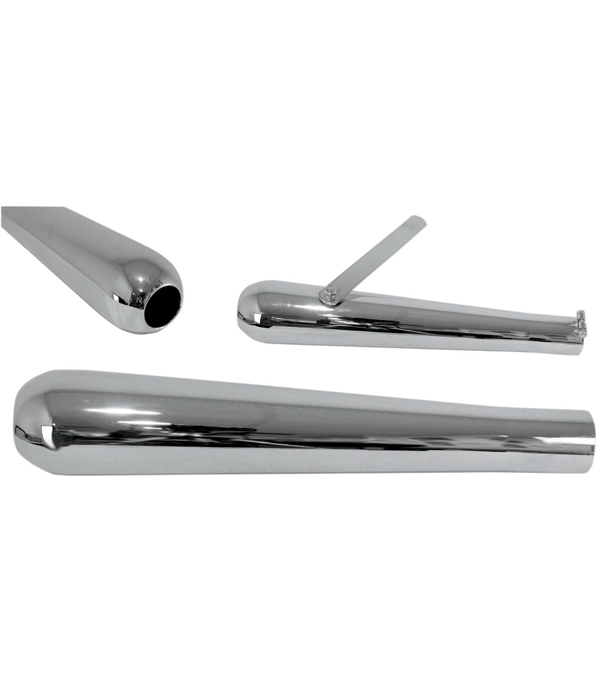 Roadhawk 60 échappement MegaphoneMegaphone chromé dans le style des décennies 1950 et 1960 avec corps de chicane perforé40,9 cm (16-1/8”) de longueur totale avec arrivée de?44,5 mm (1-3/4”)Sortie lisse et arrondie d’un diamètre de 76 mm (3”)Les boulons fixent aisément le silencieux au tube pour un design parfaitement propreCollier de fixation et trois adaptateurs différents diamètres pour silencieux inclus