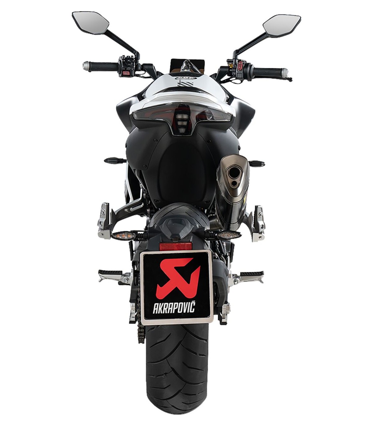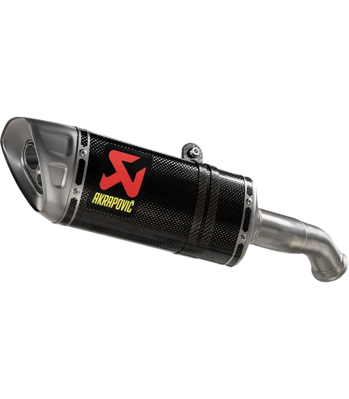 Silencieux slip-onApparence compacte inspirée de la course qui se fond à merveille dans les lignes et la palette de couleurs de la motoÉlaboré à partir de matériaux ayant fait leurs preuves en course, notamment la fibre de carbone (pour l’enveloppe extérieure et la patte d’échappement), le titane (pour l’embout) et l’acier inoxydable (pour le tube de liaison)Gain de poids de 30,6 % (0,9 kg) par rapport à la ligne d’usine standard et sonorité sportive profonde qui met en valeur le moteur bicylindre de 799 cm³Donne la priorité à la réponse à l’ouverture des gaz et à la maniabilitéSynonyme de gain de performances, en particulier à moyen et haut régimes, puisqu’il augmente la puissance de 1,3 kW (1,7 ch) et le couple de 2,5 Nm à 4 900 tr/min, comme l’ont montré les tests réalisés sur effectués sur banc d’essai Akrapovic le comparantInstallation facile sans qu’il soit nécessaire de changer de cartographie