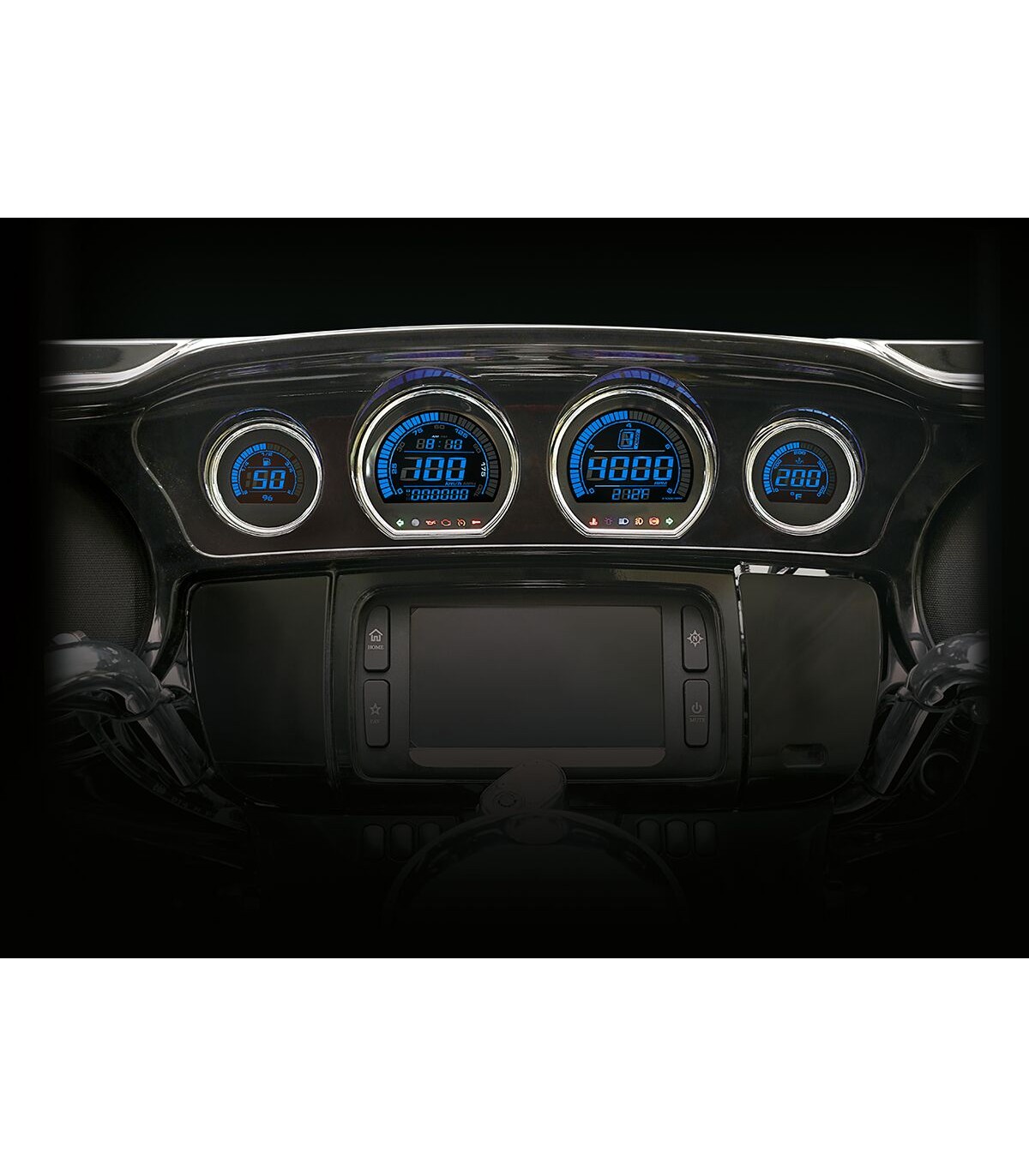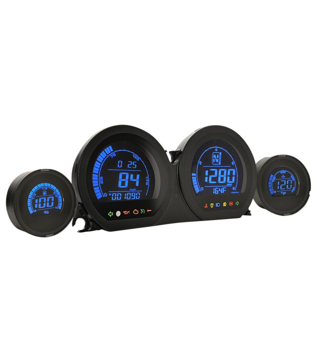 HD-03 - Four-Piece LCD Gauge KitPlug-and-playFits directly on OEM dash and connectorsColor changeable LCD displayIncludes speedometer, tachometer, odometer, gear indicator, tripmeter, engine temperature, oil temperature, and fuel level gaugesIndicator lights for oil, engine warning, warning light, high beam, fog light, and turn signalsSpecifications: Tachometer (0 - 9,999), RPM Shift Light (2,000 - 8,000 RPM), Maximum RPM (0 - 8,000 RPM)Speedometer (0 - 199 MPH), Maximum Speed Record (0 - 199 MPH), Overspeed Warning (19 - 199 MPH)Odometer (0 - 999,999 miles), Tripmeter A/B (0 - 9,999 miles), Mileage Maintenance (300 - 10,000 miles)Engine Temperature (Standard/Customize), Oil Temperature Meter (32° F - 248° F), Maximum Oil Temperature Record (32° F - 248° F), Effective Temperature Range (14° F - 140° F)Fuel Meter (6 levels | 1 level = 16.6%), Fuel Tank Volume (Off/1 - 9.9 US Gallons), Average Fuel Consumption (Off/MPG), Remaining Mileage (0 - 6,249 miles)Volt Meter (DC 8V - 18V), Effective Voltage (DC 12V)Not for '21 and later models.