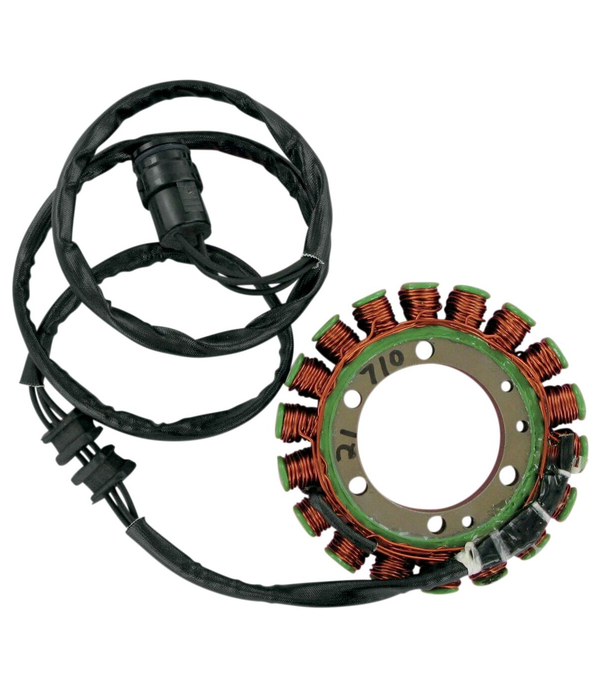 Stator pour KawasakiStators type origineStators complets à enficher directement avec toutes les rondelles en caoutchouc et embouts type origine nécessairesCertains modèles sont dotés d’une version haute performance renforcée Hot Shot fabriquée selon la technologie spéciale Mosfet qui évite toute surchauffe (uniquement si précisé)