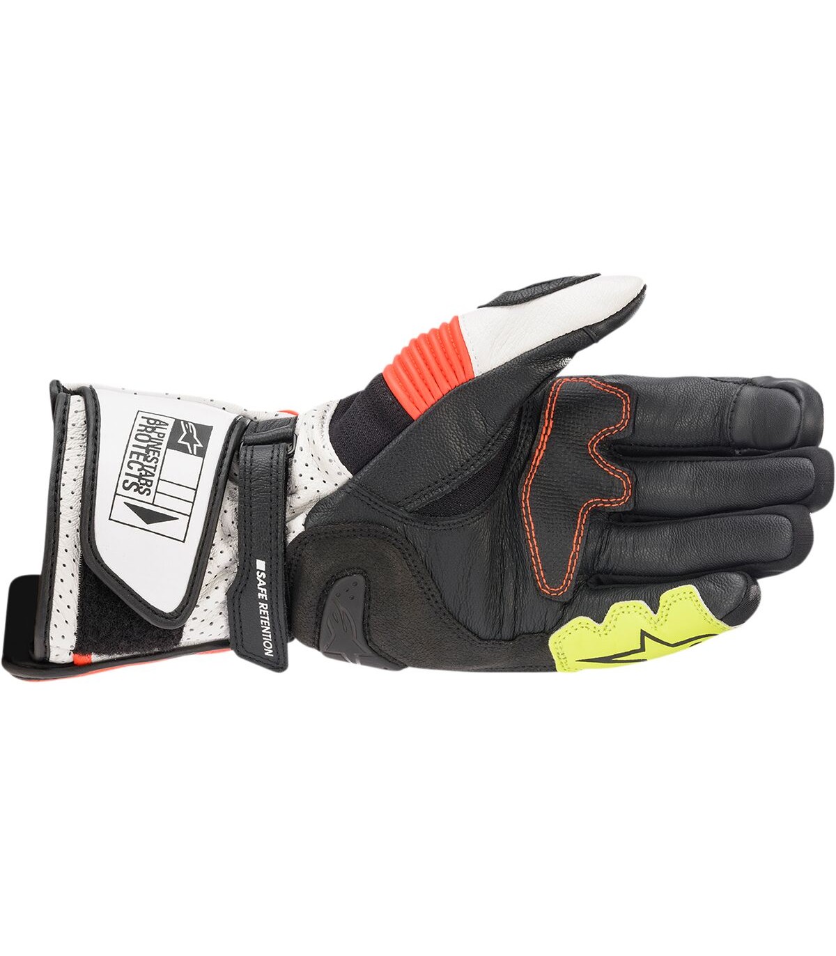 Gants en cuir SP-2 v3Fabriqués en cuir pleine fleur souple et très robuste pour une résistance à l’abrasion et une durabilité optimalesDes renforts souples en cuir de chèvre au niveau de la paume et du flanc des doigts améliorent les sensations et les performancesCoque principale renforcée avec un empiècement en cuir qui recouvre les deux premiers doigts et le poignetRenforts en daim synthétique sur la paume et les zones d’atterrissage pour une résistance maximale à l’abrasionLe curseur ergonomique de la paume constitué d’un composé de pointe et de TPU dérivé du MotoGP est doublé de mousse EVA afin de garantir d’excellentes performances en cas d’impactLe protecteur de jointure robuste, mais flexible d’Alpinestars offre une protection exceptionnelle contre les chocs et l’abrasionMousse EVA absorbant les chocs aux endroits stratégiques pour des performances supplémentaires en cas d’impactLe pont de doigt breveté d’Alpinestars empêche le roulement excessif et la torsion des doigts lors des impactsSoufflet étendu sur le pouce pour plus de flexibilité et de liberté de mouvementLe poignet perforé, le panneau supérieur en cuir et les parois latérales ventilées aux doigts aident à garder les mains au fraisPatchs rembourrés en cuir sur les poignets pour une protection amélioréeLa construction précourbée des doigts réduit la fatigueLarge fermeture à scratch au poignet pour une entrée facile et une fixation sûreBout de doigt compatible avec les écrans tactiles sur l’index et le pouce permettant d’utiliser des smartphones et des systèmes GPSGants homologués EN 13594:2015