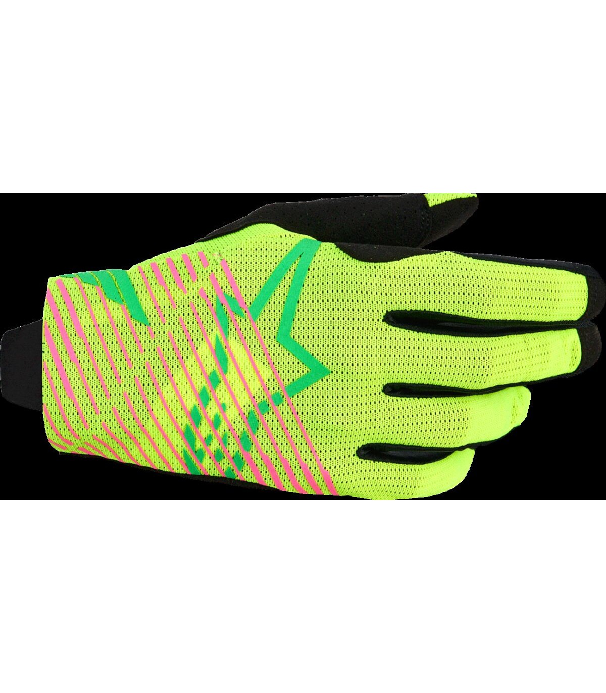 Radar Pro GlovesRadar Pro race gloves have been developed in close collaboration with Alpinestars’ top-level athletes to create a sleeker, more minimalistic design, further enhancing freedom of movement and control on the trackIncorporate a single-layer construction all around, with a single-layer 4-way stretch mesh backhand and synthetic suede side hand reinforcements for high levels of comfort and improved feeling with the bike’s controlsFor the MX26 line, the Radar Pro Gloves have conductive material for the palm and fingers, and a seamless integrated, wrist closure strapHighly breathable, ultra-lightweight and packed with excellent comfort featuresOne-piece synthetic suede palm with built-in stretch offers excellent comfort and freedom of movement, ensuring easy handling of grips and leversWrapped fingertips and silicone grip on first and second fingers for enhanced durabilityThumb patch perforations ensure enhanced airflowSynthetic suede, perforated thumb reinforcementSew-free cuff binding with internal synthetic suede provides maximum comfort on the wrist and soft touchWrapped tips for durability and silicone grip on first and second fingersConductive palm and fingers for use with smartphones and touchscreen devicesLocalized perforations on the synthetic suede thumb for performancePull tab with silicone grip for quick and easy entry into the gloveSeamless molded hook Velcro closure strap for securityPrinted graphic on backhand