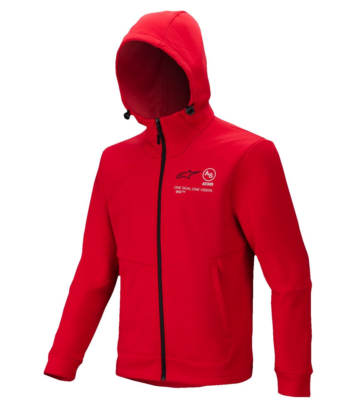 Racer MX Fleece HoodieMX-inspired branding and graphics with the Alpinestars ONE GOAL ONE VISION motto and bold Alpinestars wordmark on upper back of hoodieStructured breathable fleece and constructed with a windproof lining on the chestErgonomic cut to fit comfortably over MX gearCompact hood has an attachment loop and snap button to anchor hood in place during training sessions or ridingAdjustable lower hem with shock cord to personalize the fitAuto-lock YKK zipper for durabilityZippered hand pockets